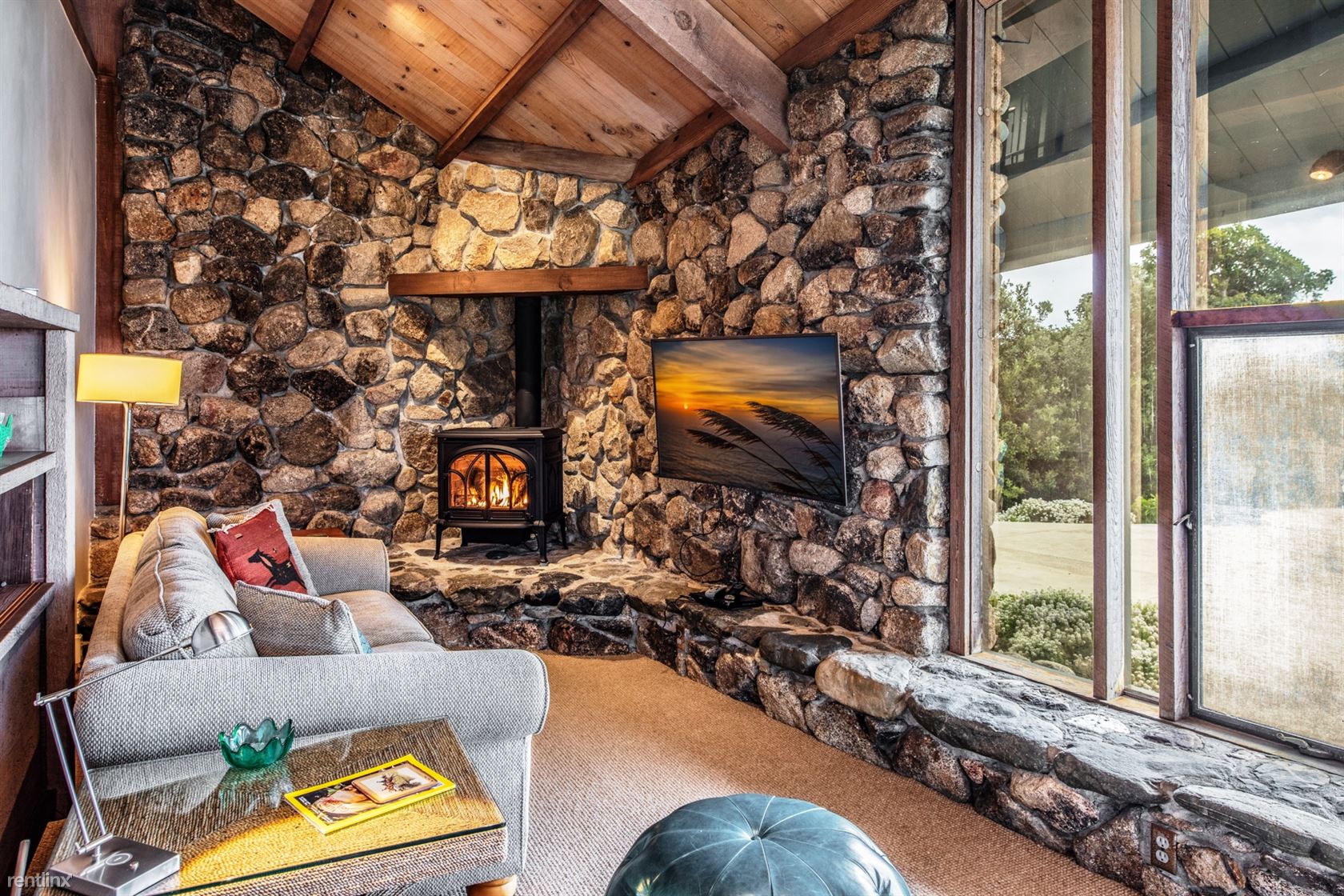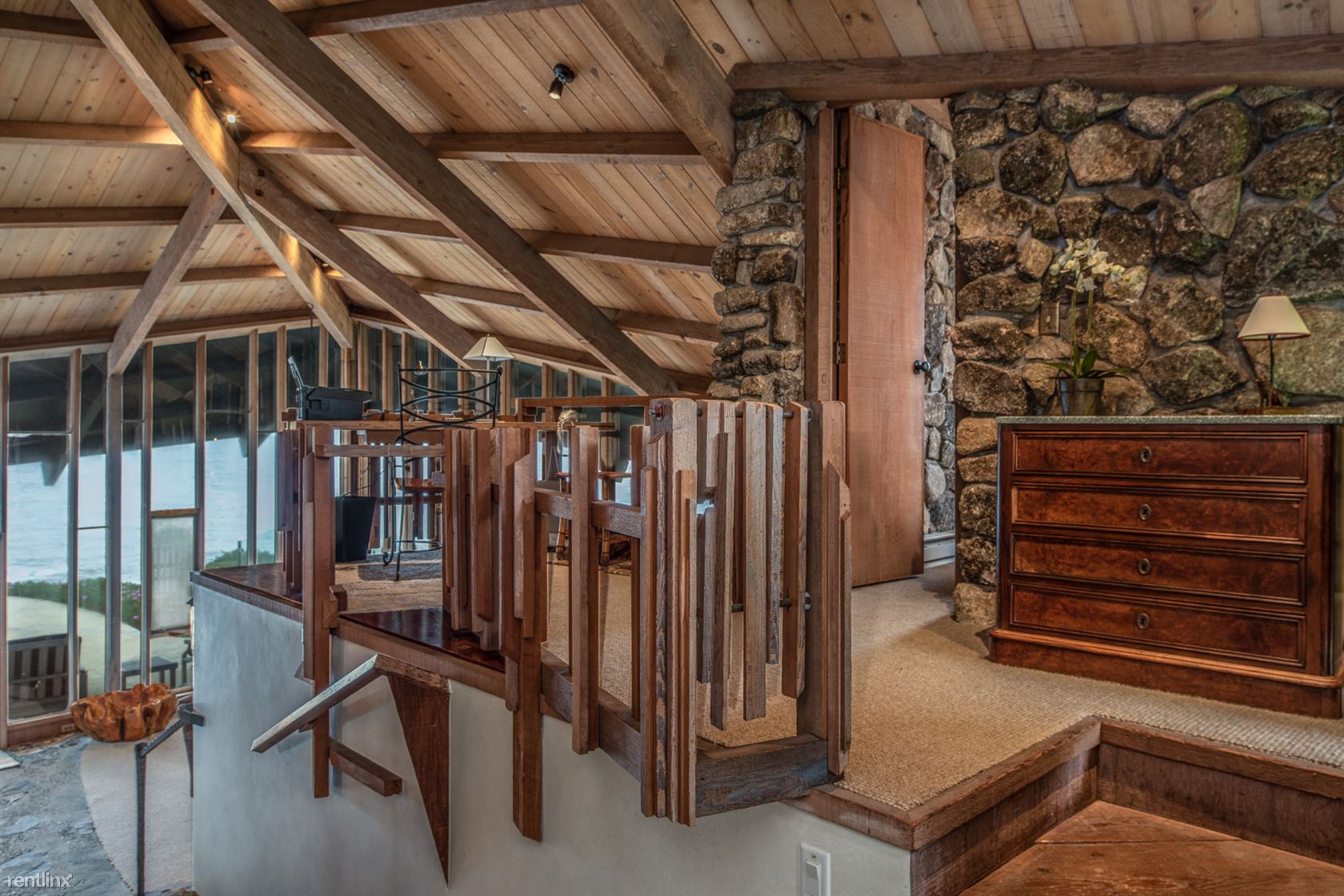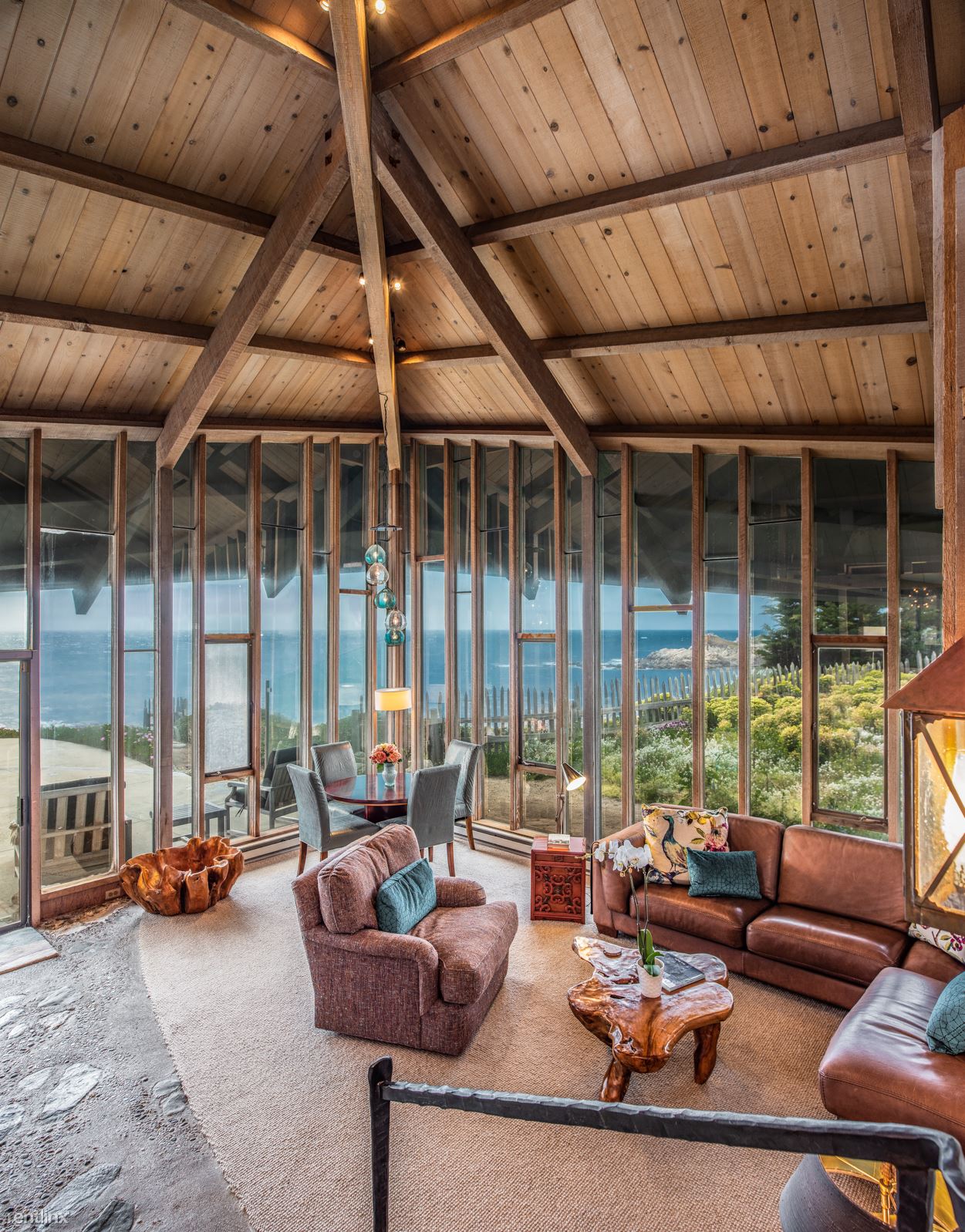 Flanked by windswept cypress trees and a small garden with bougainvillea, roses and hydrangea, the home includes intriguing mid century touches such as vintage pendant lighting, natural stone interior walls and stone steps inside the home. An oceanfront patio offers stone benches and a table, an ideal place to meditate or to watch whales and sunsets.