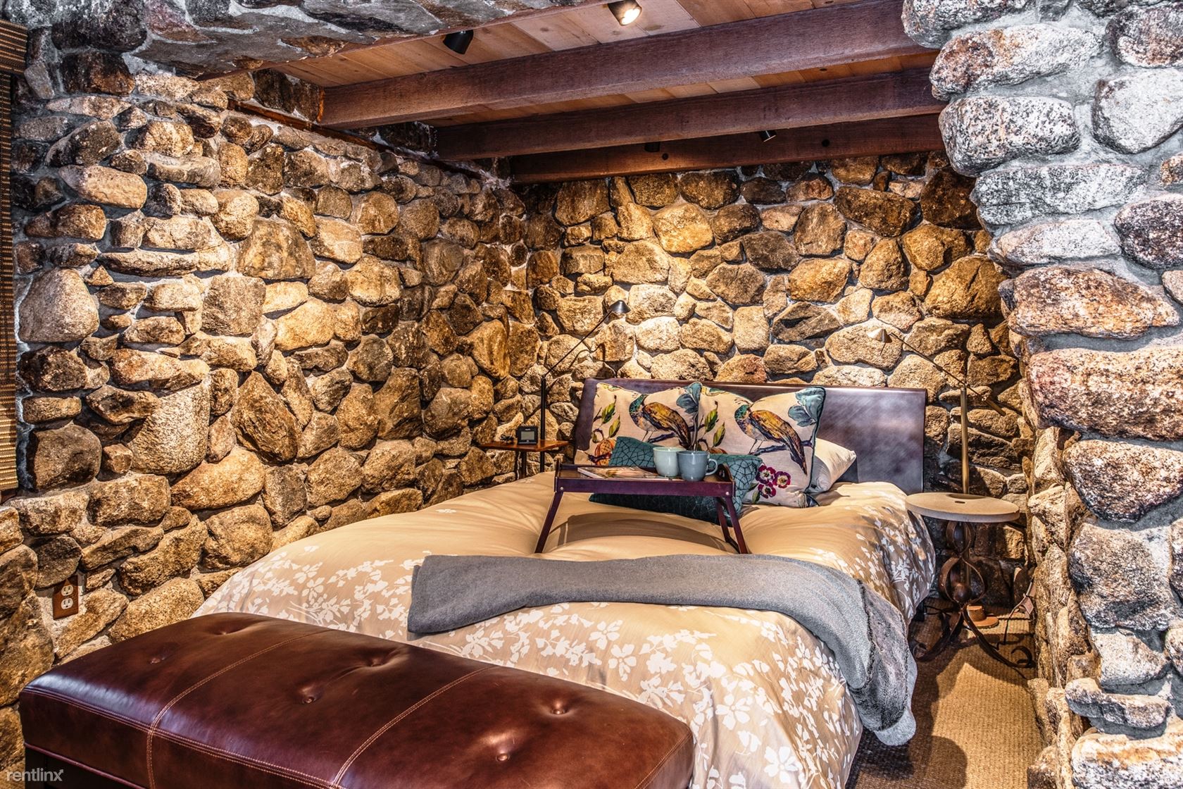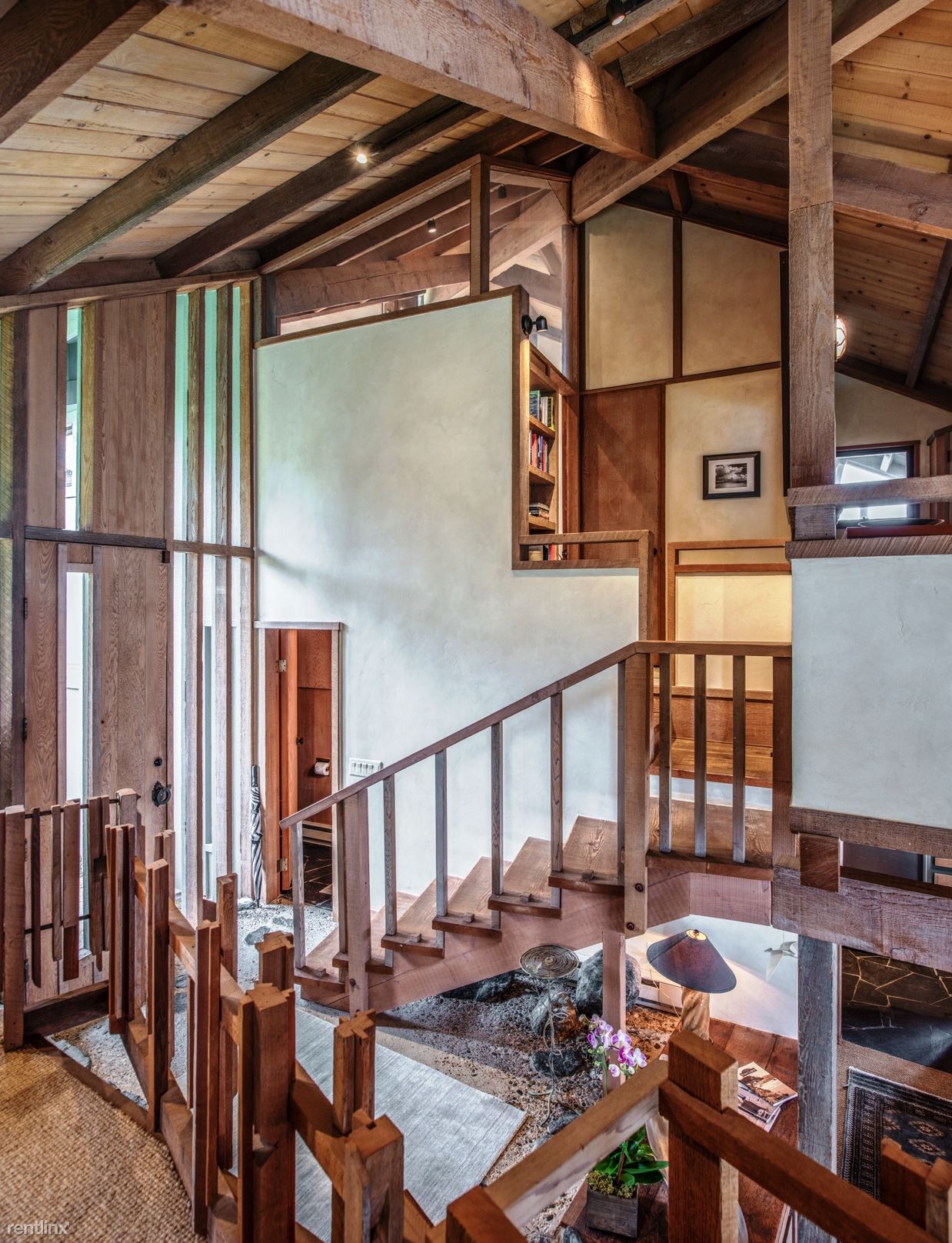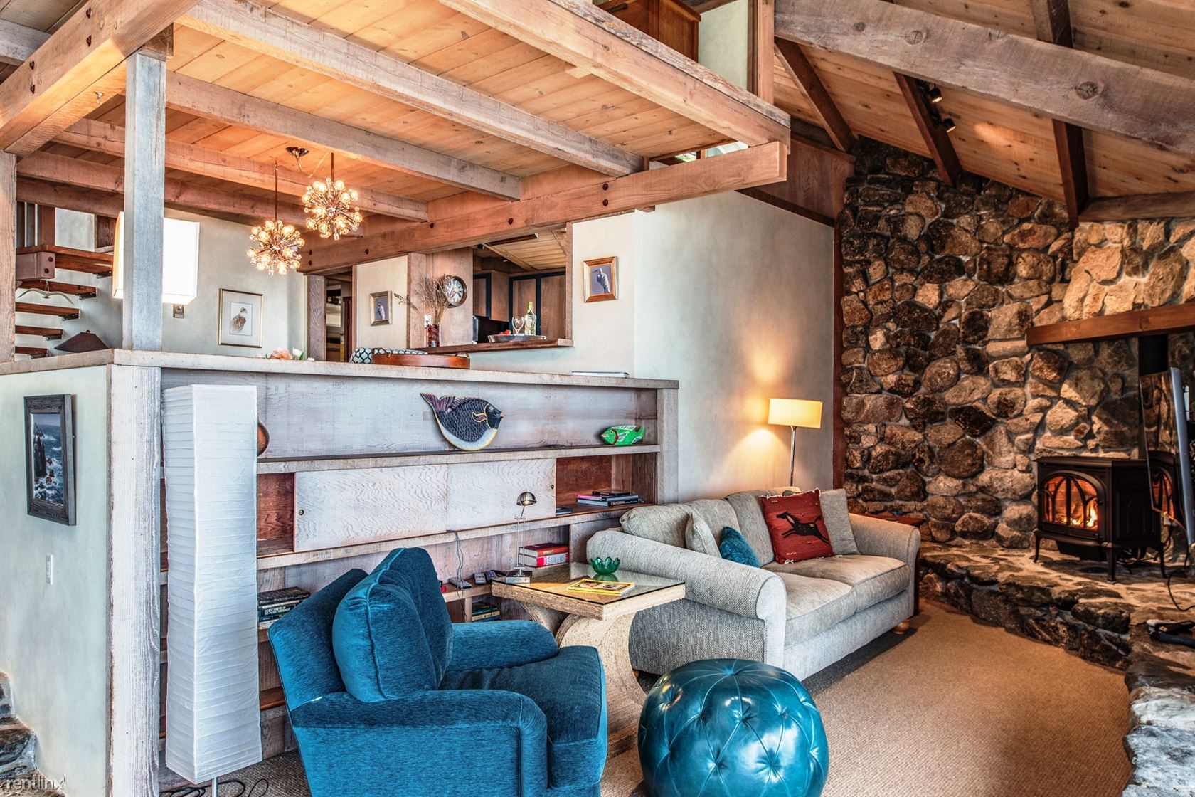 Flanked by windswept cypress trees and a small garden with bougainvillea, roses and hydrangea, the home includes intriguing mid century touches such as vintage pendant lighting, natural stone interior walls and stone steps inside the home. An oceanfront patio offers stone benches and a table, an ideal place to meditate or to watch whales and sunsets.